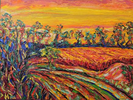 At the end of 2019 and beginning of 2020, Derek began a body of new works, many of which focus on mirrored images, knifed in oil, and inspired by fall-flooded rivers, streams, trees and pathways